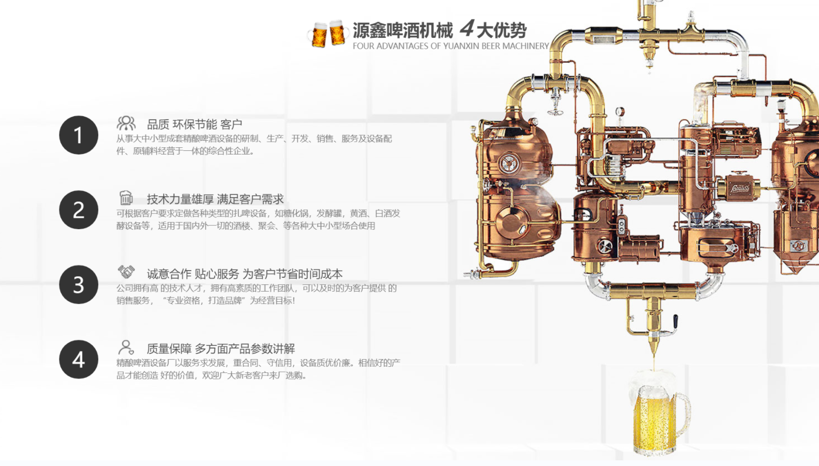 南陽市源鑫啤酒機械設備有限公司位于歷史文化名城一-南陽,從事大中小型成套啤酒、白酒自釀設備的研制、生產、開發(fā)、銷售、服務及設備配件、原輔料經營于一體的綜合性企業。公司可根據客戶要求定做各種類型的扎啤設備,如糖化鍋,發(fā)酵罐,黃酒、白酒發(fā)酵設備等,適用于國內外一切的酒樓、餐廳、家庭.聚會、酒吧等各種大、中、小型場合使用。公司擁有技術人才,擁有高素質的工作團隊,可以及時的為客戶提供**的銷售服務。公司以“專業資格,打造品牌”為經營目標,“卓越質量,信賴價格”為經營宗旨,以質量求生存,以服務求發(fā)展,重合同、守信用,設備質優(yōu)價廉。相信好的產品才能創(chuàng)造 好的價值,歡迎廣大新老客戶來廠選購。...